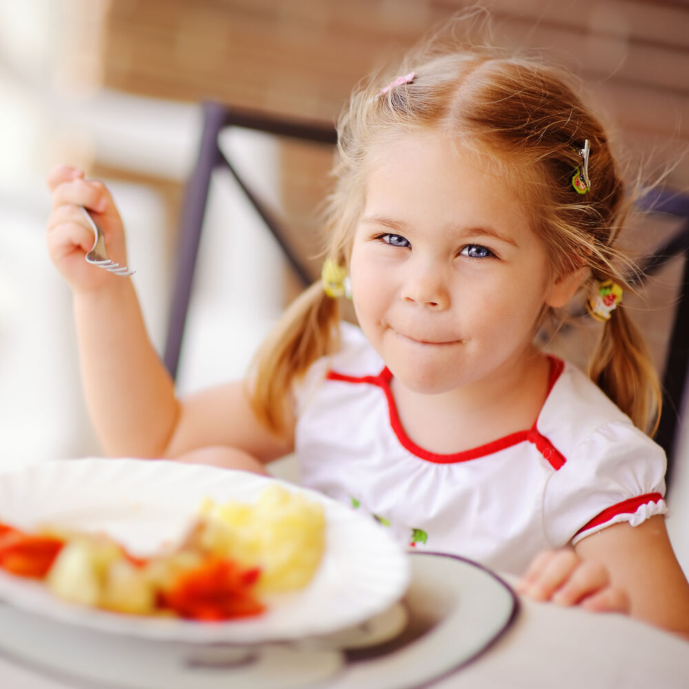 Frühstück, Mittagessen und Abendessen sollten fix am Speiseplan stehen, sowie ein oder zwei Zwischenmahlzeiten. Achten Sie auf Zeichen Ihres Kindes ob es Hunger hat oder satt ist. Drängen Sie es nicht zum Aufessen.